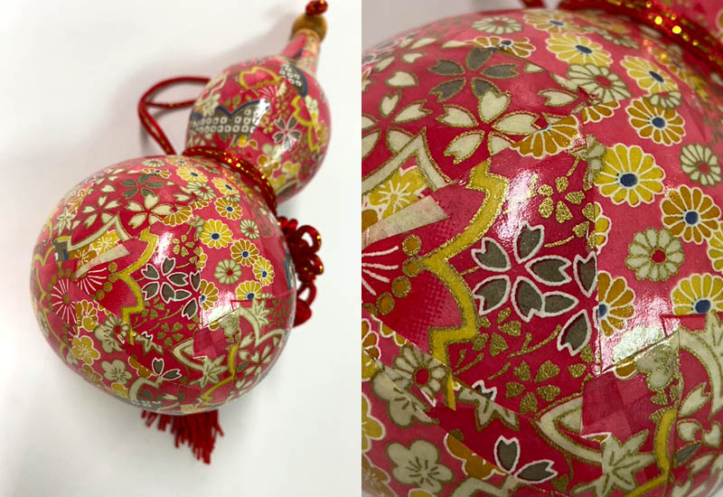 經由仔細拼貼日本和紙,多層上漆,費工費時所呈現極具和風的葫蘆作品,在配上結飾,成為精美裝飾品