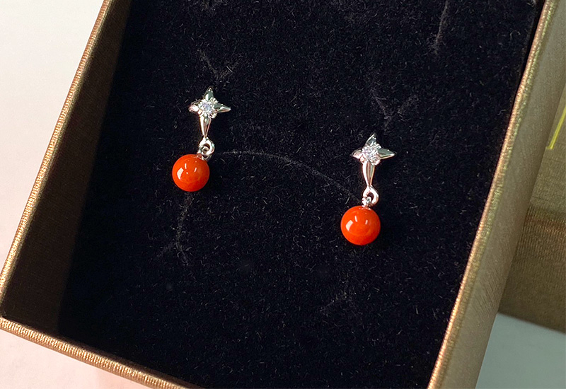 以垂墜的耳環樣式搭配圓珠珊瑚,優美小巧。是幸福、吉祥、圓滿、永恆的象徵。