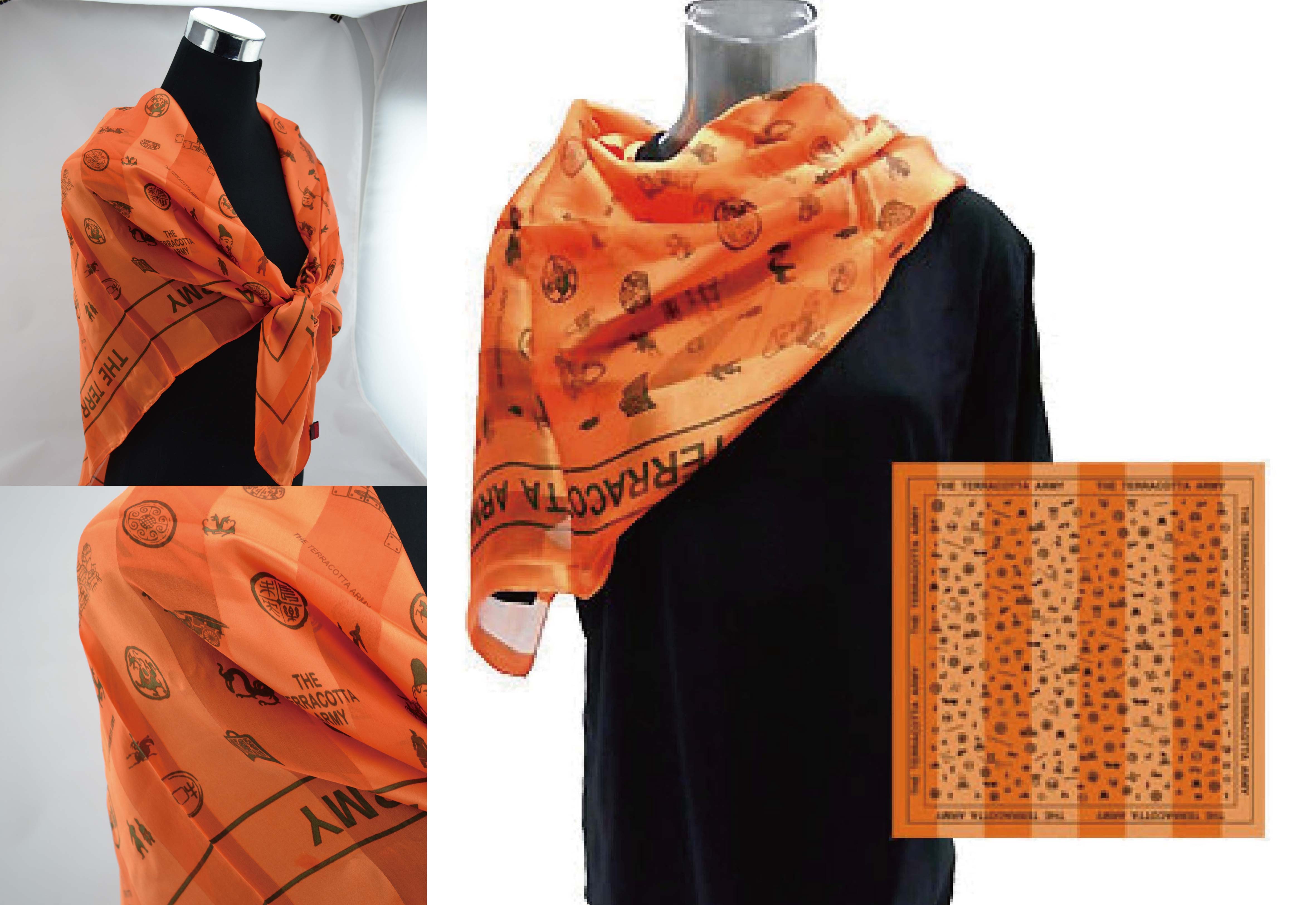 秦始皇陵墓兵馬俑並未在史籍上有所記載,故未被人知,也因此歷經二千餘年而能保存原貌。1974年3月29日陝西大旱,臨潼縣村民楊志發在挖井打水時意外發現兵馬俑碎片,當時村民稱這些陶塑為「瓦爺」。在人們初次見到兵俑時,兵俑衣著、武器的顏色還十分鮮艷,非常好看,歷經兩千年威武不減;但是在考古學家挖出土時,受空氣氧化影響,數分鐘內即漸漸剝落消失,只剩下一般大眾印象中的陶土色。1976年-1978年,考古隊增添了考古、保護、照相、修復等人員,各項發掘工作全面開展。1979年10月1日,秦始皇兵馬俑博物館開始向國內外參觀者展出。(wiki介紹)兵馬俑 秦文化方絲巾-橘色(大) 秦朝文化 秦朝歷史 秦朝 文化 正方形 方形 橘色 橘 方絲巾 絲巾 圍巾 披肩 衣服配件 配件 穿搭 兵馬俑創意商品 兵馬俑創意 兵馬俑商品 個展回顧 Terracotta Army Square Silk scarf Qin Dynasty Culture Orange Large Clothing accesories