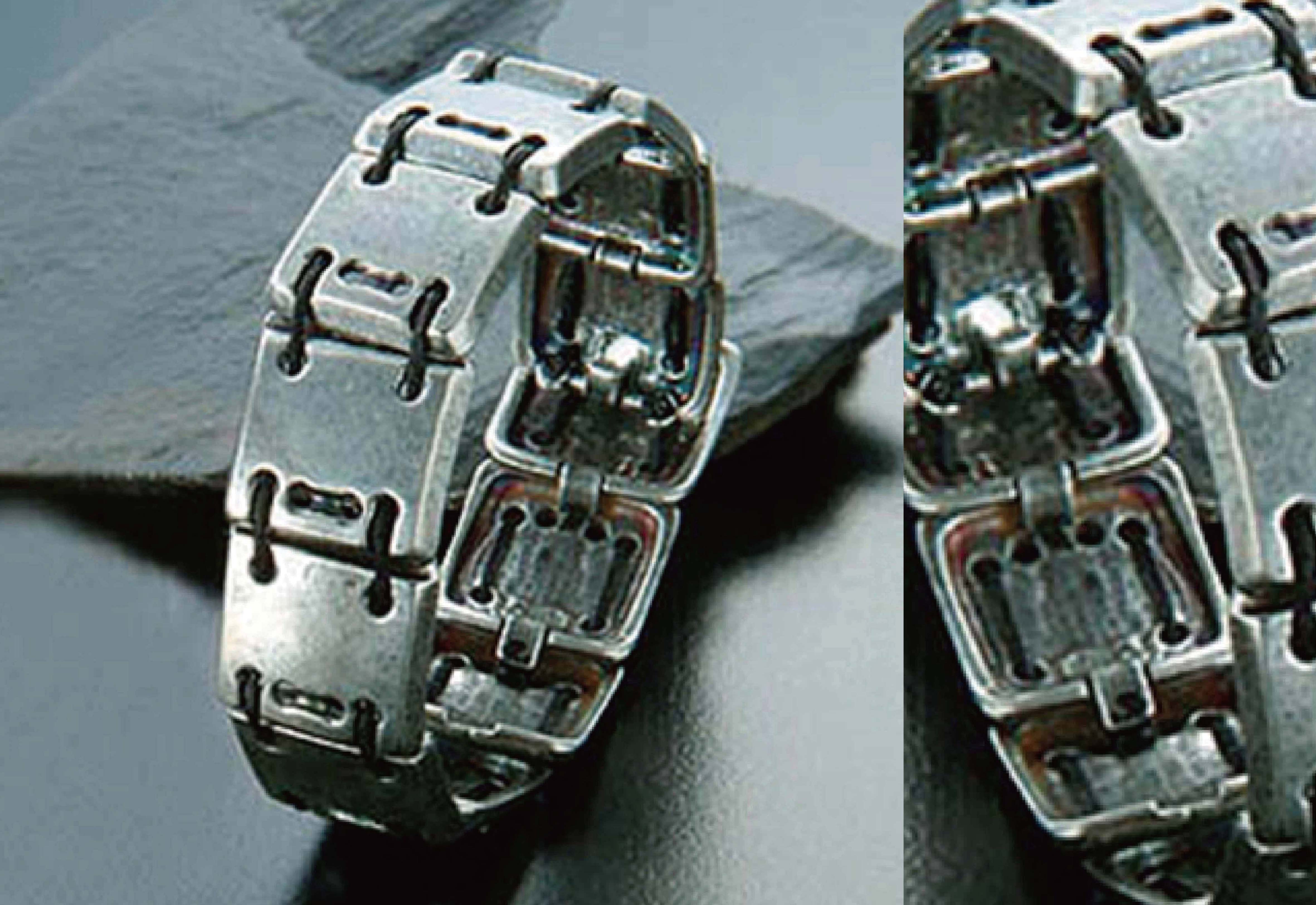 兵馬俑的鎧甲由一塊塊甲片編結而成,具威嚇及防衛雙重效果。本系列飾品強化鎧甲片塊狀結構與堆疊的視覺美學,並以特殊拋光手法營造光與影的黑白視覺效果,帶給使用者另一種奢華與豪邁的時代趣味。