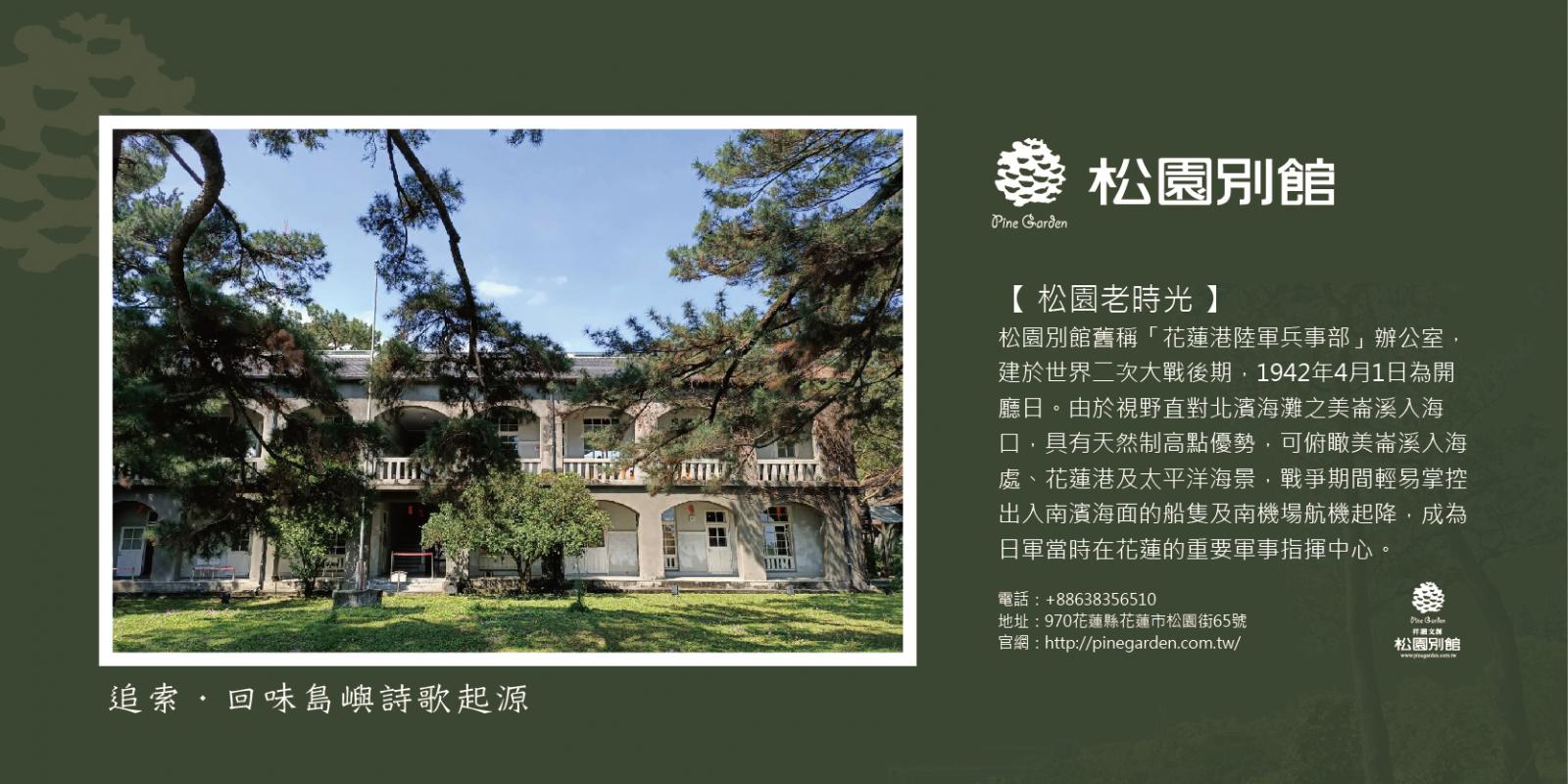 松園別館舊稱「花蓮港陸軍兵事部」辦公室,建於世界二次大戰後期,1942年4月1日為開廳日。與鄰近「放送局」(民國33年5月1日設,現中廣公司花蓮 台)、「海岸電台」(長途電信管理局,現中華電信)、自來水場(自來水公司美崙淨水場)等皆有松林連成一片。由於視野直對北濱海灘之美崙溪入海口,具有天然制高點優勢,可俯瞰美崙溪入海處、花蓮港及太平洋海景,戰爭期間輕易掌控出入南濱海面的船隻及南機場航機起降,成為日軍當時在花蓮的重要軍事指揮中心。