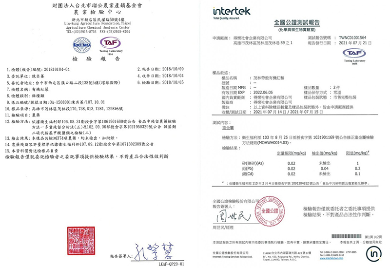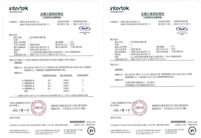 11.2016-2022年:通過各種無農藥、無防腐劑、無糖精等檢測至少30張以上報告。