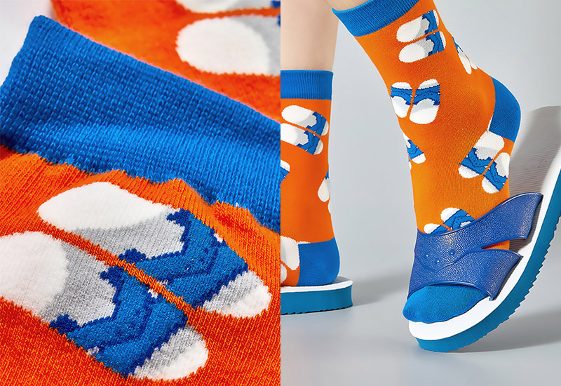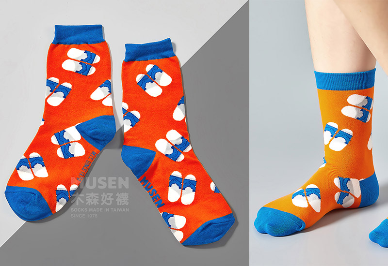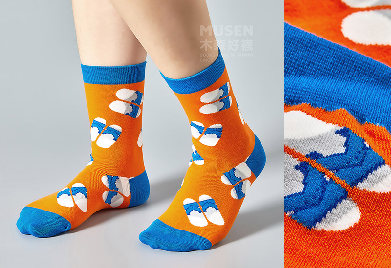 台灣印象針織襪-藍白拖 藍白拖鞋 襪子 blue and white slippers pattern socks 台灣印象襪子 台灣特色襪子 中筒襪 長襪 中長襪 運動襪 微笑台灣MIT認證 綿襪 好穿 彩色襪子 橘色 黃色 藍色 花花襪 彩虹襪 年輕感覺 活潑 裝可愛風 俏皮感 sock stocking