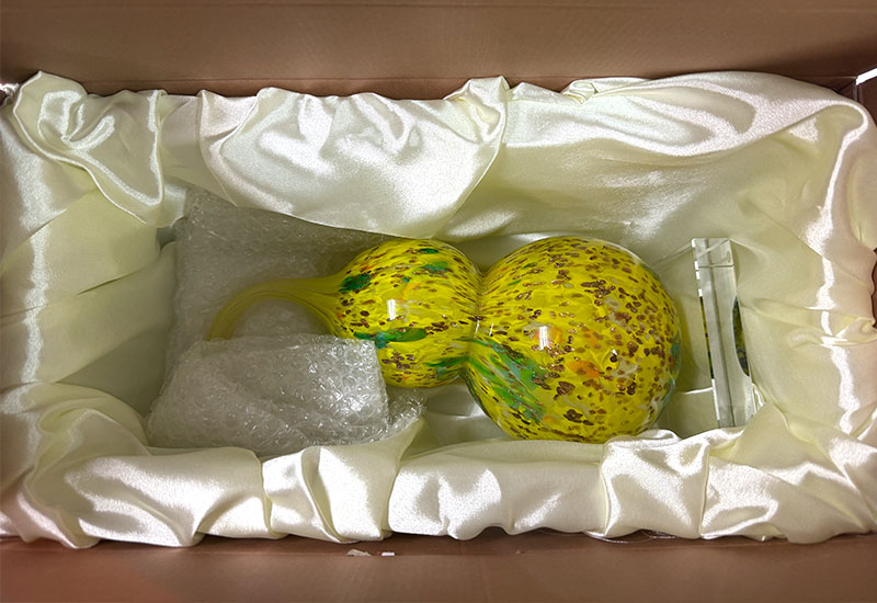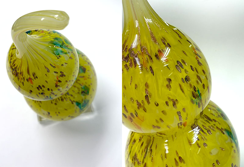 葫蘆取諧音福祿,以玻璃漿高溫結合吹製及熱塑一體成型而成。
