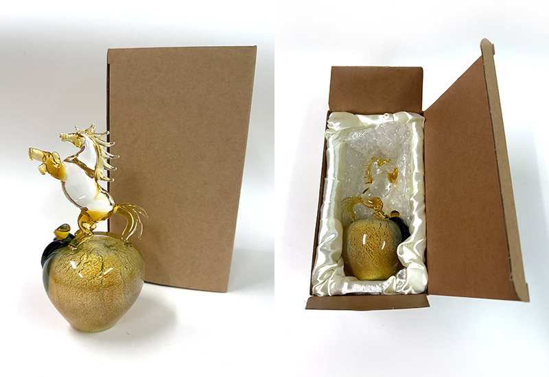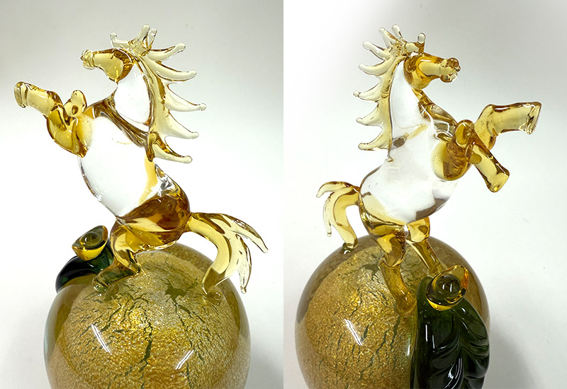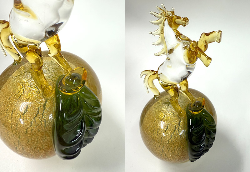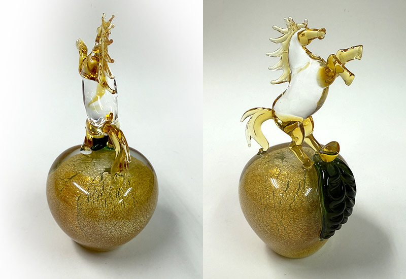 以傳統坩堝窯爐手工熱塑打造的十二生肖系列,每件皆立於銀箔烤金蘋果之上,象徵平安、富貴與好運相隨。玻璃質地透亮、金箔光澤華麗,是兼具寓意與美感的收藏精品。