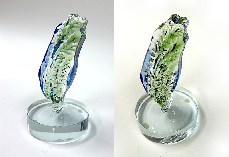 以玻璃壓模技法成形,透過漸層展現台灣海岸的浪影與光線。羽形象徵守護與希望,在透明玻璃中呈現出細緻紋理與自然流動感。