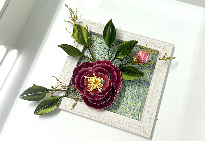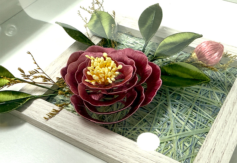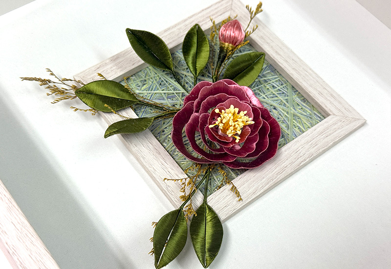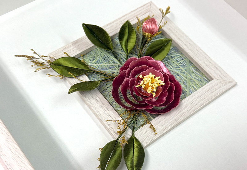 芙蓉盛放,寓意「福榮」,承載著人們對幸福與榮耀的祝願。此作以纏花工藝纖絲纏繞,層疊而成的花瓣如水波般柔潤,映照著時光裡不滅的情思。深紅芙蓉在木質框景中綻放,如同台灣傳統宅院裡的一抹暖色,將福澤與喜悅綻放於日常。命名「絲念」,既是工藝中絲線纏結的心意,也是寄託人們對福祿安康、家運昌榮的綿長思願。