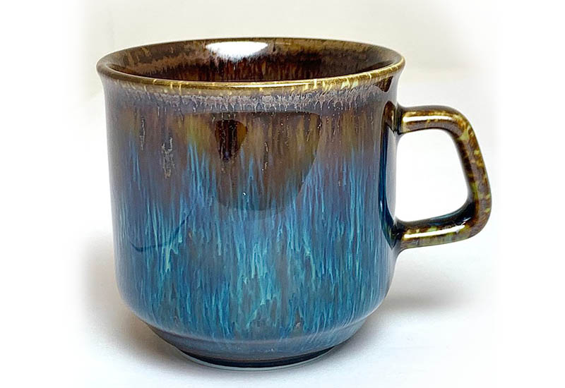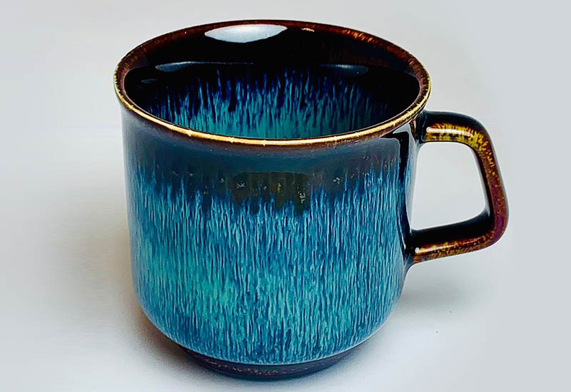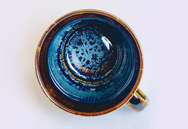 利用釉水內的氧化鐵和鍛燒過的氧化鈷與礦物元素燒制的天目。利用各種礦物本身的化學元素不同,會產生相斥相融的特點,配合物理反應的燒制曲線加速礦物的流速形成兔毫反應,猶如希臘神話,海神波賽頓的雙眼,浩如煙波,洞若秋眸!