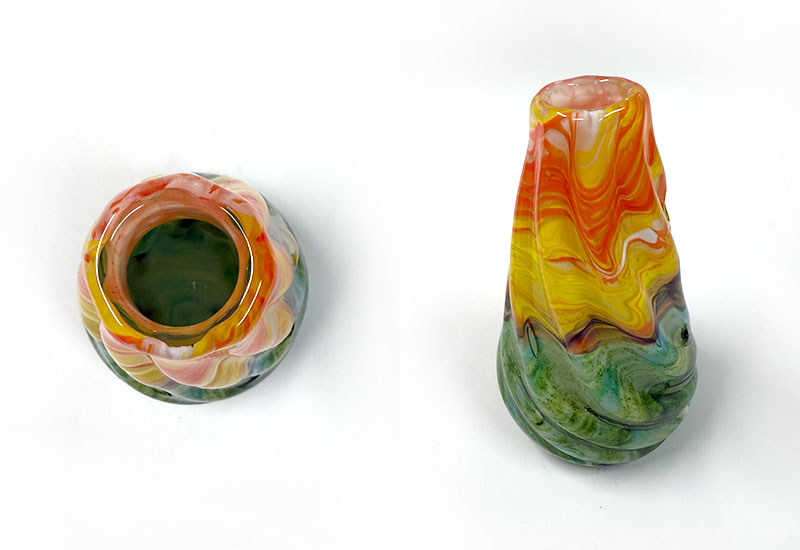 於1300度玻璃漿結合不同係數玻璃材質配色透過吹製及手工拉製塑型出各種不同風格的藝術品。