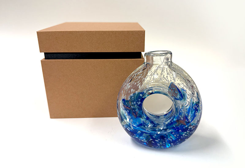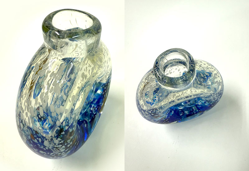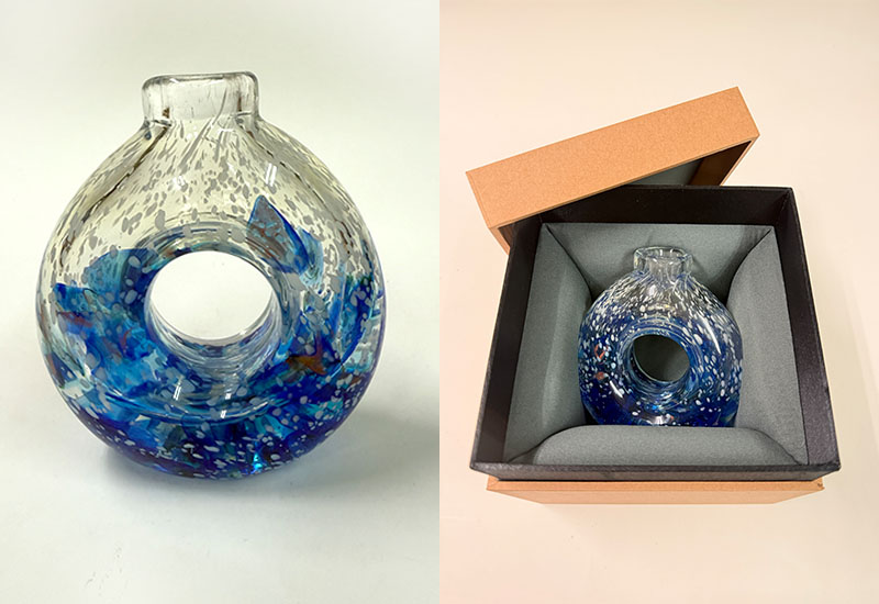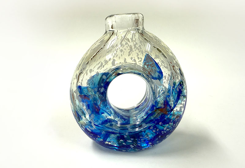此件成品,以其流動的藍色紋理和圓環造型,讓人聯想到浩瀚的星海和無盡的宇宙。藍色與透明玻璃的交融加入夜光粉使其宛如宇宙中的星雲,展現出無限的深邃與神秘。光線穿透玻璃時的折射效果,猶如星辰閃爍,讓人感受到宇宙的壯麗與奇妙。