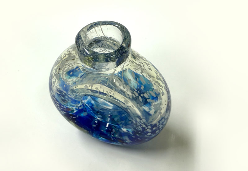 於1300度玻璃漿結合不同係數玻璃材質配色透過吹製及手工拉製塑型出各種不同風格的藝術品。