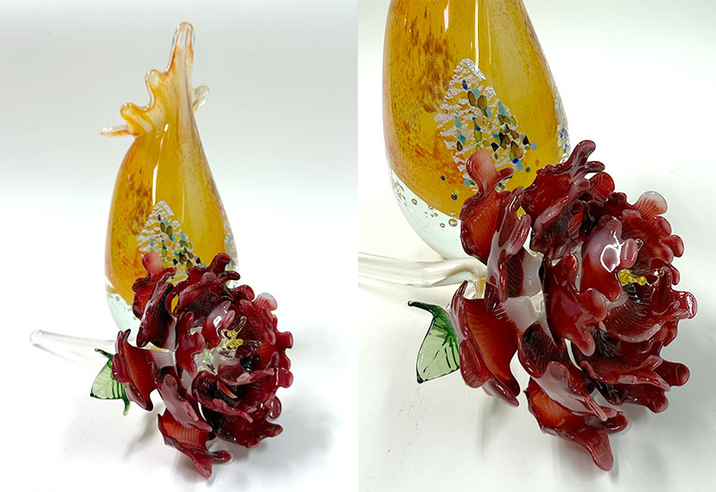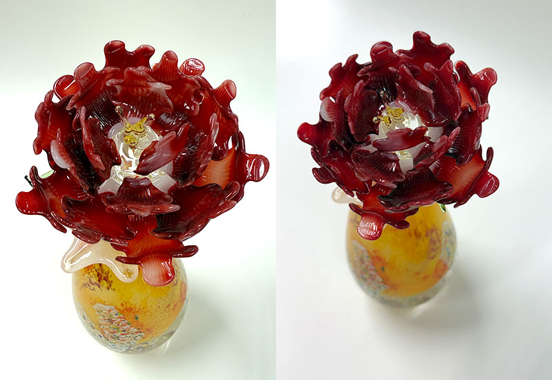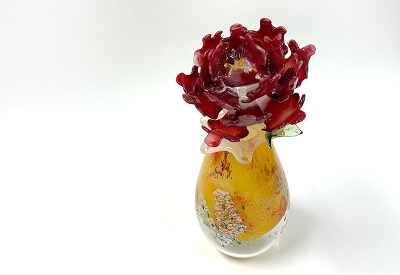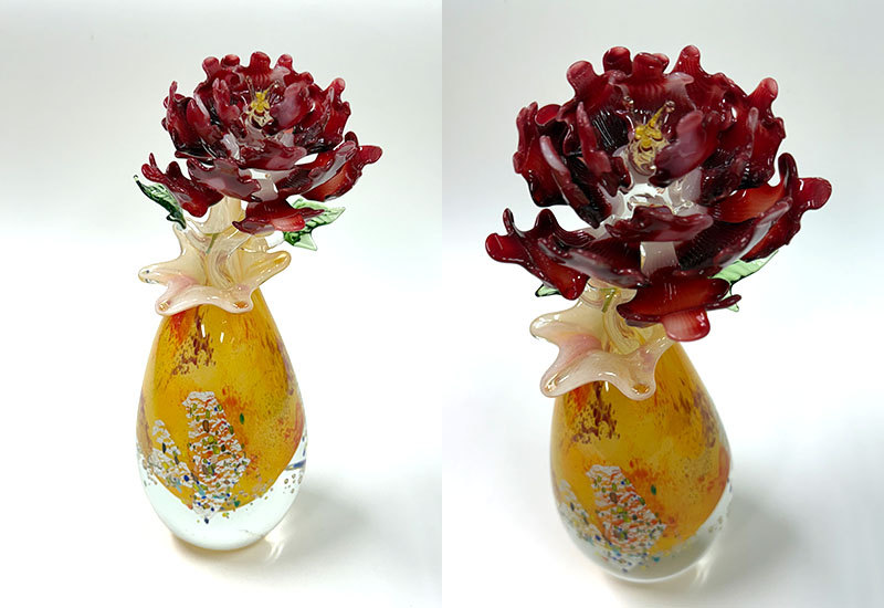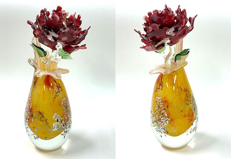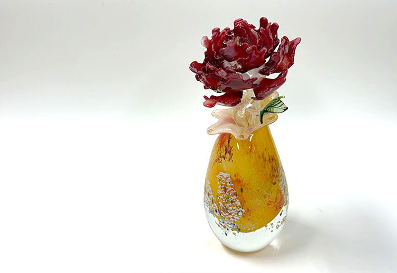 玻璃花瓶流動如山水墨染,牡丹花則以熱塑技法細膩塑形,層層花瓣綻放姿態,象徵富貴與繁華。作品可獨立亦可組合擺設,展現玻璃材質的靈動與藝術融合之美。